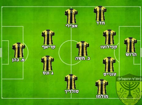 הרכב משוער: אריאל הרוש; שי חדד, ניסו קפילוטו, אנדרס טונייס, לאנדרי מולמו; אופיר קריאף, ברק משה, עומר אצילי, סינטיהאו סולליך, בראיין ג'ונס; איציק כהן.
