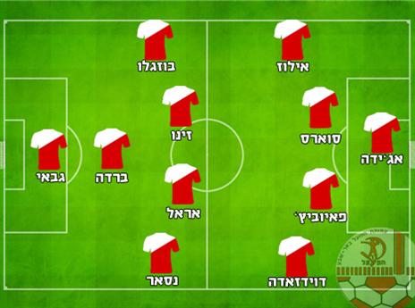 הרכב משוער: אוסטין אג'ידה; אביתר אילוז, וויליאם סוארס, טומיסלאב פאיוביץ', אופיר דוידזאדה; לוטם זינו, גל אראל, מאור בוזגלו, סיראז נסאר; אליניב ברדה, דובב גבאי.