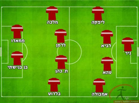 ההרכב המשוער: גל ניר; גיא ליפקה, יניב לביא, לוואי טהא, עמנואל אמבולה; בן מלכה, יוגב לרמן, תמיר כהן, אסי בלדוט, צ'ם ממאדו; סער בן בנישתי (דה סוזה).