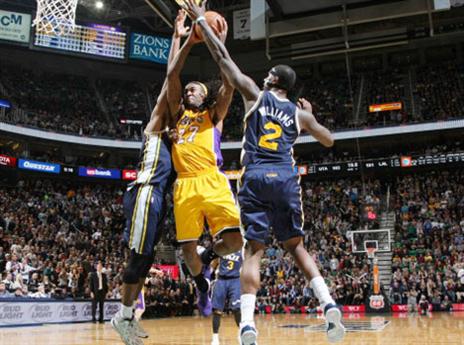 אפילו הקבוצה עם המאזן הגרוע ביותר במערב הצליחה לנצח את הלייקרס (17:13). במצב של שיוויון 103:103, גורדון הייווארד מיוטה החטיא אך דרק פייבורס, אחד השחקנים הכי אתלטים בליגה, היה במקום כדי לתקן וניצח את המשחק כשהטביע את הריבאונד שתי שניות לסיום. הייווארד קלע 24 נקודות ומסר 9 אסיסטים לג'אז (23:9) וגיבור הניצחון, פייבורס, הצטיין מתחת לסלים עם 18 נקודות ו-14 ריבאונדים. הלייקרס חסרו את פאו גאסול שוב בשל מחלה וכריס קיימן שעלה במקומו בחמישייה קלע 19 נקודות, קלט 10 ריבאונדים והשיג גם 3 חסימות.