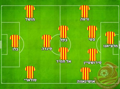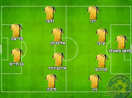 הרכב משוער: חואן פאבלו; שרן ייני, איתן טיבי, קרלוס גארסיה, יואב זיו (עומרי בן הרוש); גל אלברמן, דן איינבינדר (מהראן ראדי), ערן זהבי, דור מיכה, טל בן חיים; ראדה פריצה.