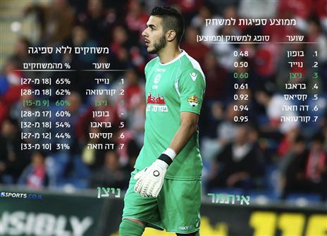 בזמן ששחקן התקפה נמדד בכמות השערים והבישולים, במקרה של שוער המדדים שונים לחלוטין. כשבוחנים שוער בודקים בעיקר שני מדדים: ממוצע הספיגות למשחק ובכמה משחקים הצליח לשמור על רשת נקייה וכשבוחנים את ניצן ביחס לשני המדדים הללו, אתם תופתעו לשמוע ששוערה של מכבי פ"ת נמצא במקום מרשים במיוחד ביחס לשוערים הטובים ביבשת: טיבו קורטואה, דויד דה חאה, מנואל נוייר, בופון, קלאודיו בראבו ואיקר קסיאס.