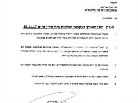 אחר הצהריים, תובע ההתאחדות ניר רשף, שלח מכתב לבעלי בני יהודה, בדרישה שיחזור בו מהדברים שאמר. "התנהגותך מבזה מכפישה את ההתאחדות, את בתי הדין ואת בעלי התפקידים השונים. לאור האמור, הינך נדרש לחזור בך מן הדברים, באופן פומבי. ככל שלא תפעל באופן האמור לעיל, אשקול לפעול בפן המשמעתי".