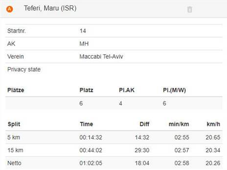 אתלטים נוספים שהצליחו לשפר את שיאם האישי: איימרו עלמייה (אורן השרון) סיים במקום ה-10 עם תוצאה של 1:02:58 ושבר את שיאו האישי אשר עמד על 1:04:04.  מלקאם ג'מבר (אורן השרון) סיים במקום ה-14 עם תוצאה של 1:04:15 והצליח לשפר את שיאו האישי שעמד על 1:05:58. בצד הנשי, סלאמאוויט באיולין (מכבי ת"א) המתאמנת עם לונה צ'מטאי אצל דן סלפטר, הגיעה למקום ה-3 עם תוצאה של 1:09:02.