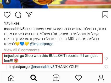 בתוך כך, בהמשך ישיר למתיחות בינו לבין יאניס ספרופולוס, ג'רמי פארגו הגיב אתמול להודעת המועדון שלפיה הוא עדיין סובל מכאבים בברכו ואמר: "תפסיקו עם הבולשיט הזה, אני בסדר גמור". הגארד אמר את הדברים בתגובה לדף אוהדים שפרסם את ההודעה הרשמית של מכבי ת"א אתמול בסיום האימון המסכם. כזכור, אתמול דיווחנו כי בינו ליווני קיימת מתיחות גדולה, שבעקבותיה זכה לקרדיט מועט במשחקים האחרונים. בינתיים, הוא הספיק למחוק אותה.