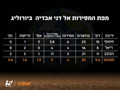 אחת הטענות העיקריות נגד זוסמן ואבדיה היא שהם פאסיביים מדי. במסגרת הניתוח, בדקנו אם בכלל מתאפשר להם להיות אקטיביים. ובתרגום פשוט - כמה פעמים מוסרים להם את הכדור. באמצעות פלטפורמת הסטטיסטיקה המתקדמת של Instat, בדקנו את כמות הדקות והפוזשנים שהם שיחקו ב-3 המשחקים עד כה ביורוליג, וכאמור, את מספר המסירות שהם קיבלו מחבריהם. התוצאות לפניכם.