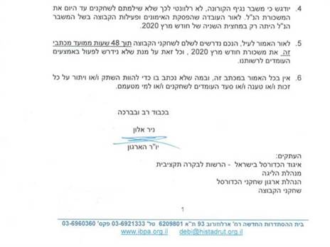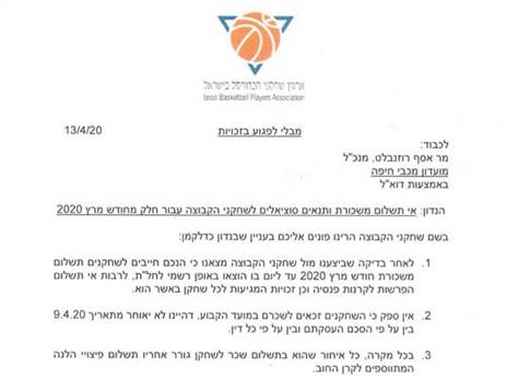 כמו כן, באיגוד טענו כי משבר הקורונה לא רלוונטי לאי תשלום השכר מכיוון שהפסקת האימונים ופעילות הקבוצה הייתה רק בחצי השני של אותו חודש (15.3). בנוסף באיגוד מסרו כי כל איחור בתשלום שכר לשחקן גורר אחריו תשךום פיצויים: "הנכם נדרשים לשלם לשקני הקבוצה את השכר תוך 48 שעות. כל זאת על מנת שלא נידרש לפעול באמצעים העומדים לרשותנו".