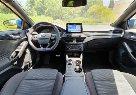 אם מצאנו כמה נקודות חן יפות בודדות בחלק החיצוני שמבדילות את הגרסה הזאת מהאצ’בק רגילה, אזי שבתוך המכונית יש אף פחות סממנים לכך וזהו פספוס נוסף. ההגה אמנם חתוך בבסיסו ומאחוריו נמצאים שני מנופים קטנים להחלפת ההילוכים במצב ידני שפועלים בצורה טובה ומשכנעת שמשפיעה באופן מהיר על ביצועי המכונית, אבל פרט לאלה, לתפרים במושבים ולמדבקה בסף הדלת לא מצאנו שום סימן נוסף שישמח את ליבם של היושבים בתוך המכונית ובמיוחד את הנהג, התחושה היא כי מחלקת העיצוב הייתה מאוד מאופקת וחסר שם משהו שיתסיס את ליבו מעבר לעוד דגם האצ’בק אחר. לו היו מתאמצים קצת יותר בפורד, אפשר היה להציג מסך כניסה ספורטיבי יותר במולטימדיה עם התנעת הרכב. אפשר היה לשנות את לחצן ההתנעה לצבע אדום, להוסיף כמה תפרים בחגורות הבטיחות ולהדביק את אותו סמןל שנמצא על הכנף, גם מעל חוגת ההילוכים. חפירה באתר של פורד העולמית מגלה כי קיימת גרסת ST-Line X עם חלק מהדברים שהזכרנו לעיל, אבל זאת לא נמצאת בישראל ואולי אף תעלה יותר ולא משתלם ליבואן להביא אותה.