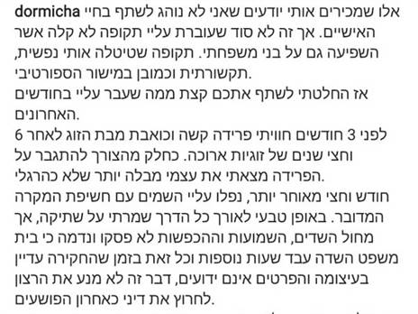 לראשונה מאז חשיפת פרשת הכדורגלנים והקטינות, דור מיכה פותח את הלב. בפוסט שפרסם היום (שישי) בחשבון האינסטגרם שלו, הוא סוגר את החשבונות מהסיפור - שגרם לו להשעיה מצד קבוצתו, מכבי תל אביב - אבל גם בוחר לקחת אחריות: "למרות שאני בסך הכל רווק בן 28 והייתי משוכנע שמדובר בבגירות, מתוקף היותי דמות מוכרת ומודל לחיקוי, אני מצטער אם היו כאלה שהתאכזבו ממעשיי".