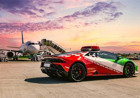 המגויסת הטריה לשדה התעופה היא למבורגיני הורקאן EVO שהוצגה ב-2019. זו נעטפה לצרכי הנמל בגווני הדגל האיטלקי, כרזות של דגל השחמט כדי שחלילה לא נשכח שהיא מתחרה בקטגוריית GT3 וכמובן שיש לה את תאורת הניווט המחויבת מעל ראשי הנהגים בצבע כתום. ההורקאן היא המכונית הנמכרת ביותר של למבורגיני עד היום עם למעלה מ-14 אלף יחידות בשבע שנים. הישג מרשים, אבל הישג שכנראה ישבר בקרוב משום שלמבורגיני אורוס, ה-SUV של האיטלקים כבר חצה את נקודת ה-10,000 עותקים בתוך שנתיים בלבד.