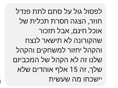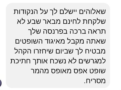 בהודעות נוספות, חריפות וחמורות לא פחות, שהועברו לטיפול, נכתב: "שתקבל שיתוק בראש. בשורות רעות בחנוכה"; "אתה חתיכת בן שרמוטה, מ****ן בתחת, מהמר מסריח"; "שתקבל שיתוק בפה ולא תוכל לשרוק".