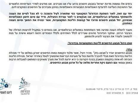 "בימים אלו נמצאת מדינת ישראל במבצע חיסונים נרחב עליו אנו מברכים. אנו מודעים לסדרי העדיפויות הלאומיים ועל חשיבות העליונה לתיעדוף האוכלוסיות המבוגרות והאוכלוסיות בסיכון ומברכים על החיסונים המוקצים להם. יחד עם זאת, לאור השפעת הכדורגל המקצועני כפי שתוארה לעיל הסכנה כי לא נוכל לסיים את העונה ולהשתתף במפעלים הבינלאומיים, אנו מבקשים כי לאור עצירת הפעילות, מיד עם סיום חיסון האוכלוסיות שבסיכון, יחול מבצע חיסונים מרוכז של קבוצות הליגות המקצועניות, אשר יבטיח את המשך וסיום העונה כמתוכנן".