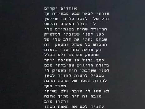 "לסיום, עברתי המון דברים בחיים - יותר קשים ממשחק כדורגל, הפסד או ניצחון. ככה שאני לוקח הכל יותר בקלות בכדורגל ומבחינה מקצועית וסומך על עצמי והיכולות האדירות שלי. אבל רציתי להגיד הכי ברור - חזרתי לכאן בשביל האהבה שלכם נטו, ואם לא תרצו שאני אהיה כאן אני לא אהיה. מאחל לכולם בריאות והרבה מאוד הצלחה".