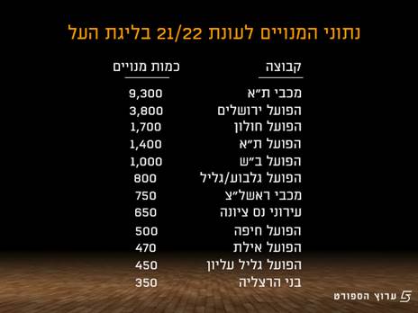 לפני שנגיע לנתונים, כמה הסברים חשובים למספרים שתראו. ראשית, הכדורסל, באופן מסורתי, מעולם לא הציג לראווה כמות גדולה של מנויים, משלל סיבות, ובראשן ההרגל הטבעי של הקהל לקנות כרטיסים ביום המשחק ולא להתחייב מראש. בנוסף, השפעות הקורונה שעדיין נותנות את אותותיהן בכל תחומי חיינו, והציבור עדיין חושש להוציא כסף מראש. יש לזכור כי השנה הכניסה לאולמות היא במסגרת תקנות התו הירוק (בדיקות שליליות בתוקף לילדים ולבלתי מחוסנים) - אלמנט נוסף שמרחיק אוכלוסיות מסוימות מהיציעים.