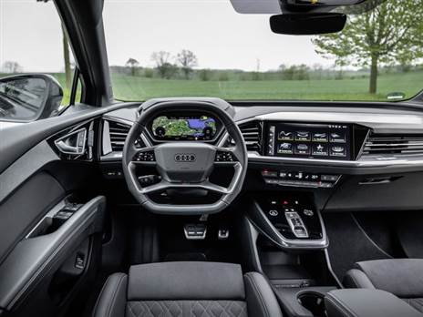 הדגם האסטרטגי מבין השניים הוא ה-Q4 אי-טרון, הרכב הראשון של אאודי שמבוסס על רצפה חשמלית ייעודית שפותחה לפני כשנתיים עבור משפחת ה-ID של פולקסווגן. זהו רכב פרופורציונלי לסגמנט C עם מידות ממוצעות לקטגוריה, מולו מתחרים כמו מרצדס EQA, ויהיה זמין במרכב קלאסי וכן מרכב ספורטבק דמוי קופה כשביניהם ניכרים הבדלים עיצוביים, בגובה וסיומת התקרה מאחור. אורכו מקצה לקצה 4.58 מ', רוחבו 2.1 מ', גובהו כ-1.64 מ', בסיס הגלגלים הוא 2.76 מ', משקלו 2 טון ונפח תא המטען הוא 535 ל'.
