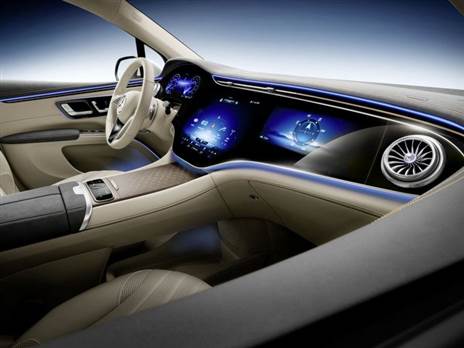 עיצוב תא הנוסעים נלקח ישירות מה- EQS המקורי וממשיך את קו הדיגיטליזציה של המותג. זה כולל משטח זכוכית מקצה לקצה בטכנולוגיית MBUX Hyperscreen המאכלס שלושה מסכים, מסך מרכזי בגודל 17.7 אינץ׳ וצמד מסכים משניים בדמות לוח מחוונים לנהג ומסך מידע לנוסע לצידו בגודל 12.3 אינץ׳ כל אחד. כיאה למעמד דיפוני התא מורכבים מחומרים שנבחרו בקפידה, תוך שימוש נרחב בעור ועץ ליצירת חווית ישיבה בטרקלין.