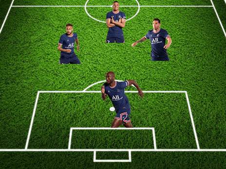 זה קרה אצל פוצ'טינו בפאריז, כאשר מסי שיחק מצד ימין, ניימאר משמאל ואמבפה חלוץ, אך בפועל תמונת המשחק היתה שונה לחלוטין: אמבפה היה מצד שמאל, ניימאר ומסי כשני מספרי 10 ואחד משלושה קשרי האמצע, בעיקר דנילו, משייט ימינה. בתרשים למטה - המחשה לאיך שזה היה נראה