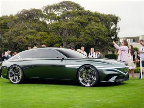 מכונית האב טיפוס X ספדיום קופה המפוארת הוצגה בפבל ביץ' בקליפורניה. ברקע - יונדאי עם שיאי מכירות