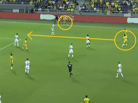 לצד זה, ואן אובריים יודע גם לתת את המסירה הלא מובנת מאליה, כמו במשחק מול אשדוד. בתמונה שמתחת (4) לקשר יש אופציית מסירה אחת ברורה ונוחה: יונתן כהן שמחכה באגף, אבל במקום זה הוא מכניס כדור עומק לדן ביטון, כזה שמבטל שני שחקני הגנה של אשדוד, מה שמוביל בסופו של דבר להזדמנות ענקית של זהבי.
