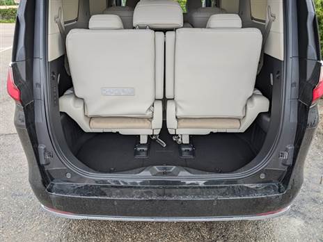 תא מטען כשהשורה השלישית בשימוש יספיק לשני קלסרים בערך (110 ליטר). יש שני וויי תלייה וכמה תאים מתחת לרצפה. המושבים האחוריים מתקפלים לצדדים ולא לתוך הרצפה כמו בקיה קרניבל למשל, כך שהנפח שנוצר מכובד אך פחות שימושי.