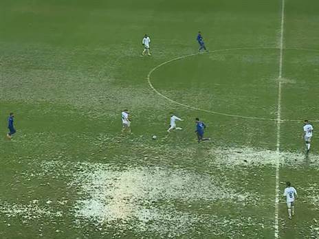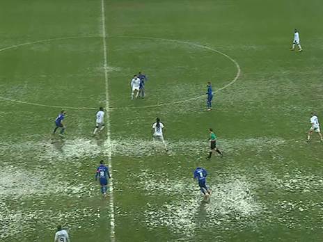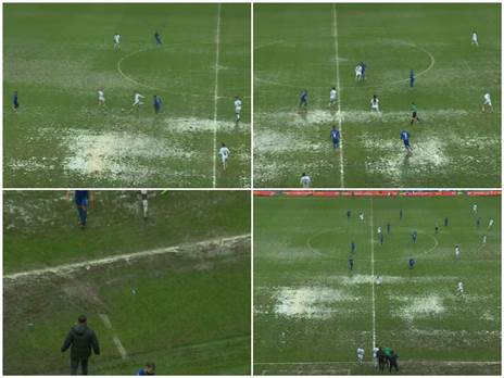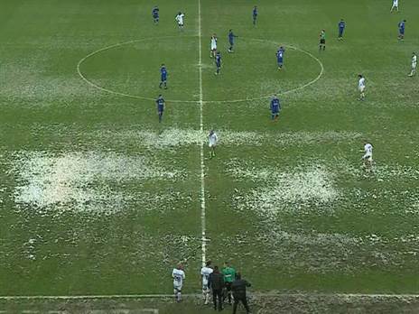 לא ייאמן. כך נראה אצטדיון המושבה במהלך המשחק בין מ.ס כפר קאסם להפועל עפולה בצהרי היום (שישי) במסגרת המחזור ה-19 בליגה הלאומית. גשם כבד וברד גרם לשלוליות על כר הדשא, הכדור בקושי קופץ והשחקנים מתקשים להתמסר ביניהם.