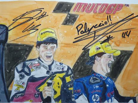 הציורים כוללים את דמויותיהם של ולנטינו רוסי, חורחה לורנסו, מארק מארקס, דני פדרוסה, פול אספרגרו וסקוט רדינג. על כולם נמצאת חתימה מקורית של אותם רוכבים, מה שמוסיף נופך יוקרתי. את הציורים ציירה תמי גורלי, פרשנית ה-MOTO GP של ערוץ הספורט.