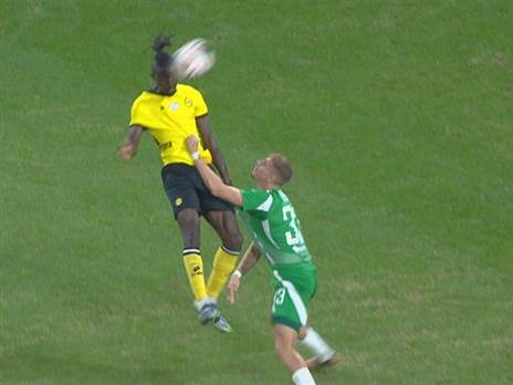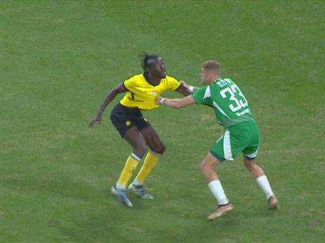 ליאם חרמש ממכבי חיפה תפס בחולצתו של מוחמד ג'רטיי ברחבת הירוקים, אבל השופט גל לייבוביץ'סימן להמשיך. גם צוות ה-VAR לא שינה את ההחלטה. האם ליהלומים הגיע פנדל? צפו בתקציר והצביעו