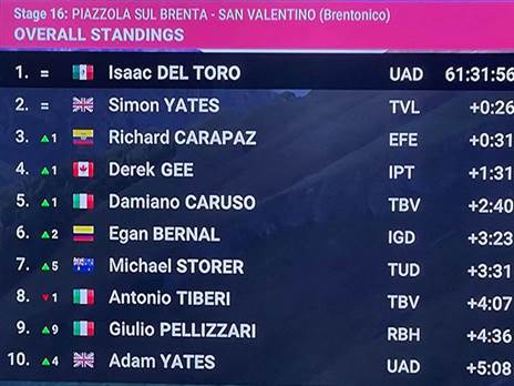 כעת הוא אחד משלושת המועמדים הבולטים יחד עם קרפאס (שלישי בדירוג, 31 שניות מהפסגה) וסיימון ייטס (שני בדירוג, 26 שניות מהפסגה) לזכות בג'ירו ד'איטליה. נזכיר כי ישראל פרמייר טק מאז הקמתה מעולם לא העמידה רוכב על הפודיום, כשנותרו עוד חמישה שלבים לסיום המרוץ, הסיכוי הזה שריר וקיים.