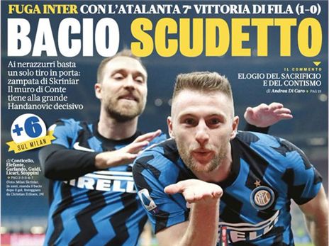 גם בגאזטה דלו ספורט סימנו את אינטר כזוכה הבאה כשפרסמו "נשיקת אליפות" בתור כותרת, עם תמונתו של שקריניאר. בקוריירה דלו ספורט הלכו באותו קו על "ידיים על הסקודטו". יש לציין שאינטר כבר הודחה מאירופה ומהגביע המקומי, וכעת נותרו לה רק 12 משחקים עד לסיום העונה. התחנה הבאה: טורינו ביום ראשון.