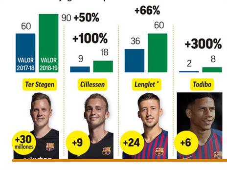 למרות זאת, יש גם כמה צדיקים בסדום. שוויו של יאספר סילסן הוכפל - מתשעה מיליון יורו ל-18 - וברצלונה תנסה למכור אותו בחלון הקרוב על מנת לפנות מקום בסגל. עוסמן דמבלה קפץ מ-80 ל-100 מיליון (25 אחוזים) בעוד מארק אנדרה טר שטגן שווה כעת 90 מיליון יורו לעומת 60 מיליון בתחילת העונה שעברה. ארתור עם ההבדל הגדול ביותר - 39 מיליון יורו המהווים 125 אחוזים (מ-31 ל-70).