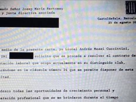 "במכתב הזה, אני ליאו מסי מבקש להתיר את החוזה שלי במועדון, וזאת בהתאם לסעיף 24 שמאפשר לי את הכוח לבצע את המהלך הזה".