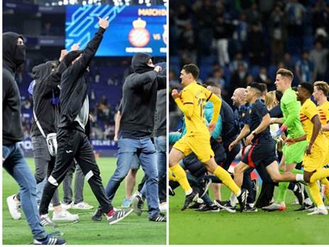 23:52: אוהדי אספניול ירדו לכר הדשא והחלו לרוץ לשחקני ברצלונה
