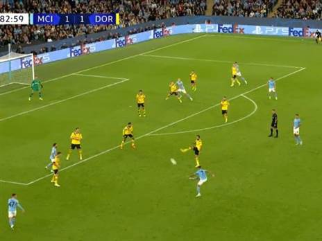 מנצ'סטר סיטי קבוצה שלוחצת גבוה, בטח במצב של 1:1 בבית. בכך היא לא שונה מקבוצות אחרות, אבל הגדולה היא בזהות השחקנים שנמצאים שם. בעת ההרמה של קאנסלו יש 6 שחקנים של סיטי שקרובים לשער, בעוד כל השחקנים של דורטמונד ברחבה. האוטובוס של השוורצגלבן מקשה מאוד, כפי שניתן לראות בתמונה מהרגע בו הכדור הגיע לקנסלו.