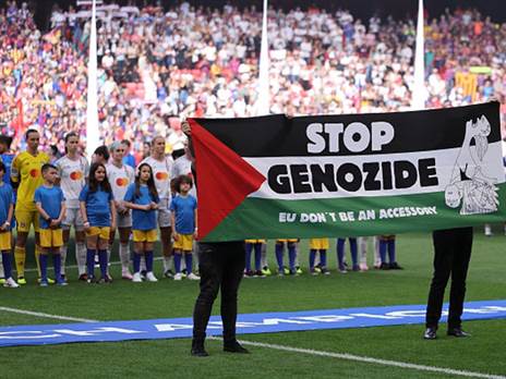 אירוע חמור מאוד היום (שבת) בגמר ליגת האלופות לכדורגל נשים בין ברצלונה לליון. לפני שריקת הפתיחה שני פעילים פרו-פלסטינים עלו לכר הדשא והניפו דגל פלסטין עליו כתוב "Stop Genozide", מסר שטוען כי מתקיים רצח עם בעזה.