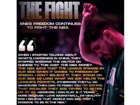 את ארדואן, למשל, כינה ״היטלר של ימינו״. את העונה הנוכחית פתח הביג-מן הטורקי בקדנציה נוספת בבוסטון סלטיקס, אולם בפברואר הועבר בטרייד ליוסטון שמיהרה לשחרר אותו. השחקן אמר אז כי ההחלטה בעניינו נבעה מהביקורת שהטיח בהנהגה הסינית, טענה שהוכחשה נמרצות בידי הקומישינר, אדם סילבר. ״הבהרתי לו שזכותו המלאה לדבר על נושאים שבוערים בו״, סיפר סילבר.