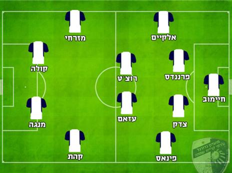 הרכב משוער: גיא חיימוב; עודד אלקיים, קאסיו פרננדס, שיר צדק, טובארנו פינאס, אדריאן רוצ'ט, עהאד עזאם, רועי קהת, אופיר מזרחי; דייויד מנגה, רוג'רס קולה.