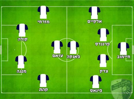 ההרכב המשוער: גיא חיימוב; עודד אלקיים, שיר צדק, קאסיו פרננדס, טובארנו פינאס; מינדאוגאס פנקה (וובה בראון), עהאד עזאם, רועי קהת, אופיר מזרחי; דויד מנגה, רוג'רס קולה.