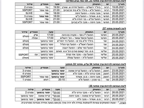 משחקי הלאומית יחודשו גם ביום חמישי, כאשר הפועל רמת גן וסקציה נס ציונה יוציאו לדרך את המחזור ה-37. יש לציין כי המשך המחזור יתקיים ביום שני ושלישי. המחזור ה-34 של ליגת העל ייערך בראשון, כאשר מכבי חיפה תנסה להבטיח את האליפות מול מ.ס אשדוד. מכבי תל אביב, שתקווה למעידה של הירוקים, תתארח באותו יום אצל מכבי פתח תקווה. המחזור ינעל בשני עם המפגש בין בני סכנין להפועל תל אביב.