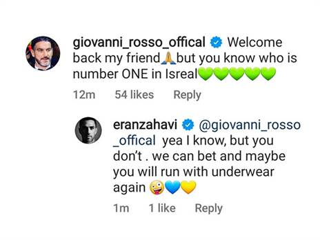 בין היתר, התכתבות שתפסה את תשומת הלב התרחשה בין ג'ובאני רוסו לערן זהבי. שחקן העבר שמזוהה עם מכבי חיפה כתב לזהבי: "ברוכים השבים חבר, אבל אתה יודע מי הקבוצה מספר אחת בישראל", בצירוף לב ירוק. זהבי השיב לרוסו: "אני יודע, אבל אתה לא. אפשר להמר על זה ואולי תרוץ שוב עם חוטיני בסוף העונה" - זכר להבטחה של ג'ובאני לפני שזכה עם הפועל חיפה באליפות המדינה ב-1998/99.