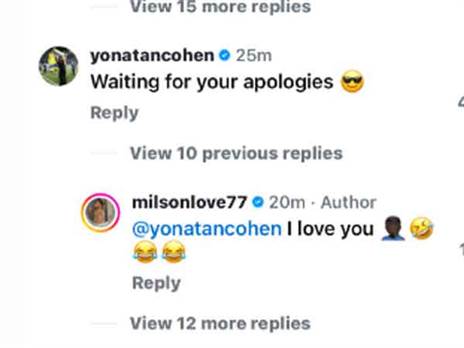 "מחכה להתנצלות ממך", יונתן כהן הגיב. מילסון הגיב לו: "אני אוהב אותך", מה שמעיד שוב על ההתחממות בחדר ההלבשה, והחזרה הקרובה.