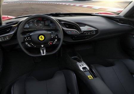 תא הנוסעים פותח בשיטת ה-HMI, שמשמעותו הצבת הנהג במרכז סביבת התפעול והתמקדות בדינמיות סביבו. זה כולל לראשונה צג דיגטלי בגודל 16 אינץ' במוטיב מתעגל שבמרכזו מד הסל"ד ומצידיו 3 תתי תפריטים עם אינפורמציה מלאה אודות מערכות הרכב. ניתן לאפיין אותו בכל מיני פונקציות בהתאם לצרכי הנהג ואף להקרין מפת מסלול על גבי המסך הראשי. מול הנהג פרארי גם הוסיפה גלגל הגה חדיש עם פקדים בסגנון טאץ'-פאד וכל הכיוונים הנדרשים לכיול המכונית עם בורר סלקטיבי בעל מצבים מובחנים.