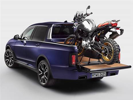 בוגרי סדרות האדוונצ'ר של ב.מ.וו יצליחו להבחין שהאופנוע שננעל על מפלס הנשיאה של הפיק-אפ הוא לא אחר מאשר ה-F850GS האחרון, ונוכח מידותיו לאופנוע תיור-אדוונצ'ר זו גם הזדמנות להראות עד כמה שימושי הטנדר שלהם בהתחשב בכך שהוא מבוסס על ה-X7 המגודל, שהינו רכב עם שבעה מושבים ובסיס גלגלים של 3 מ'. ב.מ.וו הצליחה לגלח בדיוק מה שהיא צריכה מחלקו האחורי כדי לנצל אותו למגוון של צרכים עם אורך רצפת טעינה בין 1.5 מ' ל-2.0 מ' עם זנב פתוח, ואף הפחיתה 200 קילוגרמים ממשקלו של ה-X7 הבסיסי על ידי שימוש בתרכובות משולבות של עץ-קרבון-פולימר.