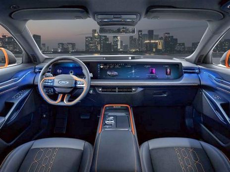 תא הנוסעים חולל מהפכה בגישה בה נקטה פורד והציג מסך יחיד ברוחב 1.1 מטר המשלב את תצוגת לוח המחוונים בגודל 12.3 אינץ' ותצוגת האינפורמציה בגודל 27 אינץ'. רזולוציית 4K ומערכת Sync + 2.0 המשלבת את הבינה המלאכותית שפותחה יחד עם Baidu וגישה לשירותים מקוונים נכללים בחבילה התקנית יחד עם הרבה צעצועים אחרים. כמו כן, פורד פיתחה במקביל את העוזרת הווירטואלית הראשונה שלה ושילבה סדרה של תכונות מקוצרות על סיפונה לשילוב אודיו, תאורה וכוונון מושב, במטרה למקסם את הנוחות בנסיעות ארוכות או בפקקים מייגעים. סדרת שירותי מנוי תאפשר לנצל תוכן נוסף המתחדש ברציפות, הודות לעדכונים מהאוויר.