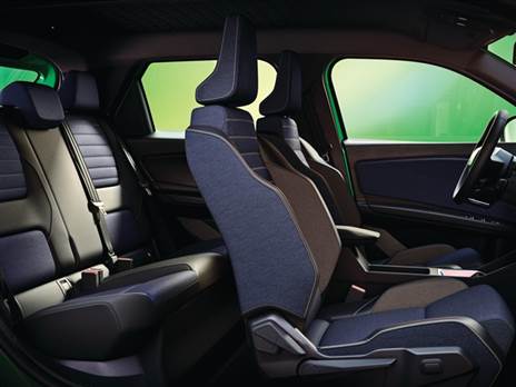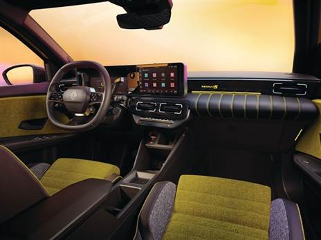 מבפנים המראה מודרני כשאותו אלמנט "ארבע פינות" מיחידות התאורה הקדמיות נמצא גם בפתחי המיזוג, עוד נמצא כאן לוח מחוונים דיגיטלי "7 בגרסת הכניסה או "10.1 בשאר הגרסאות ומסך המולטימדיה הסמוך אליו בגודל "10 בכל רמות הגימור וכולל קישוריות אלחוטיות לנייד וחנות "גוגל פליי" להורדת אפליקציות כגון ווייז, ספוטיפיי ועוד ובנוסף עוזר אישי בשם Reno. המושבים בעיצוב ספורטיבי בהשראת ה-R5 טורבו ובד ה"דנים" (ג'ינס) ושאר סוגי הבדים שיוצעו עשויים 100% חומרים ממוחזרים, כאשר לדברי היצרנית 85% מהרכב ניתנים למחזור בשנית.