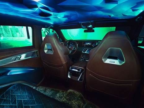 חלל הפנים מאורגן לחמישה, עם מבחר של גווני קטיפה למושבים ותאורת אמביינט בחלוקה ל-סגול, אדום ו-כחול ומתחת לרגליים שטיחים מהודרים. מערכות הפנים מייצגות את הדור הבא של בקרות המדיה של ב.מ.וו אך שיטת היישום נותרה דומה לדור הנוכחי של רכבי החשמל שלהם - חיבור זוג מסכים מאחורי מיגון זכוכית משותף, עם רזולוציה אולטרא גבוהה ומסך מלבני אורכי, מפוצל לשימוש עבור הנהג והנוסע.