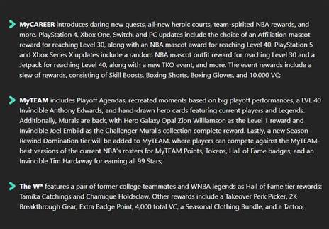 מבחינת העדכון, מצב ה-MyCAREER, מקבל מספר משימות חדשות, מגרשים חדשים ועוד. העדכונים כוללים בחירת קמע של על הגעה לרמה 30, יחד עם פרס קמע NBA עבור הגעה לרמה 40. קונסולות ה-פלייסטיישן 5 ו-אקס בוקס Series X, יקבלו קצת מעבר לכך עם תלבושות חדשות על הגעה לרמה 30 ו-Jetpack על הגעה לרמה 40, יחד עם אירוע TKO חדש ועוד 10,000 מטבעות.
