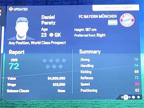 ומה עם דניאל פרץ? השוער הישראלי של באיירן מינכן מחזיק ברייטינג לא רע בכלל של 72 ובעל פוטנציאל של 81. המעלות העיקריות שלו במשחק הן הרפלקסים (73), הזינוקים (74) ועבודת הידיים (74) ושוויו עומד על כ-4 מיליון ליש"ט.