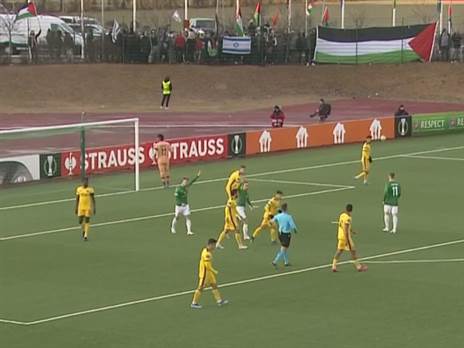 מפגינים פרו פלסטיניים מחוץ למשחקה של מכבי תל אביב: בשעה זו, הצהובים מתארחים באיסלנד אצל בריידבליק, כאשר מאחורי השער המערבי - שאליו תתקוף מכבי ת"א במחצית השנייה - מתקיימת הפגנה של עשרות מקומיים בה נתלו דגלי פלסטין (וגם דגל ישראלי אחד), וכן נשמעו הקריאות "תשוחרר פלסטין".