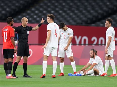 עם שישה שחקנים בהרכב מהסגל של לה רוחה ביורו האחרון, הנבחרת של לואיס דה לה פואנטה פתחה את המשחקים האולימפיים עם נקודה, מול המצרים האגרסיביים. כבר במחצית הראשונה, ספרד איבדה את אוסקר מינגסה (22) ודני סבאיוס (45+1) שנפצעו ויצאו, ומנגד התקשתה בחלק הקדמי מול שערו של מוחמד אל-שנאווי, למרות שהחזיקה בכדור כמיטב המסורת והגיע ליותר הזדמנויות, כולל אחת של חסוס ואייחו המחליף, שהחמיץ מקרוב דקה לסיום תוספת הזמן.