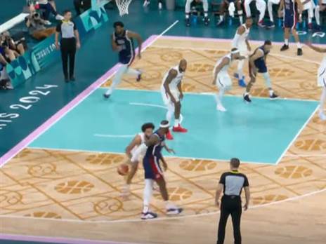 מהרגע שעלה על הפרקט בטורניר האולימפי בצרפת, ג'ואל אמביד מקבל קריאות בוז בכל נגיעה שלו בכדור מהקהל הצרפתי, זכר לסאגה שבמסגרתה הייתה לו האופציה לשחק תחת הנבחרת הצרפתית אך בחר לשחק בארה"ב.